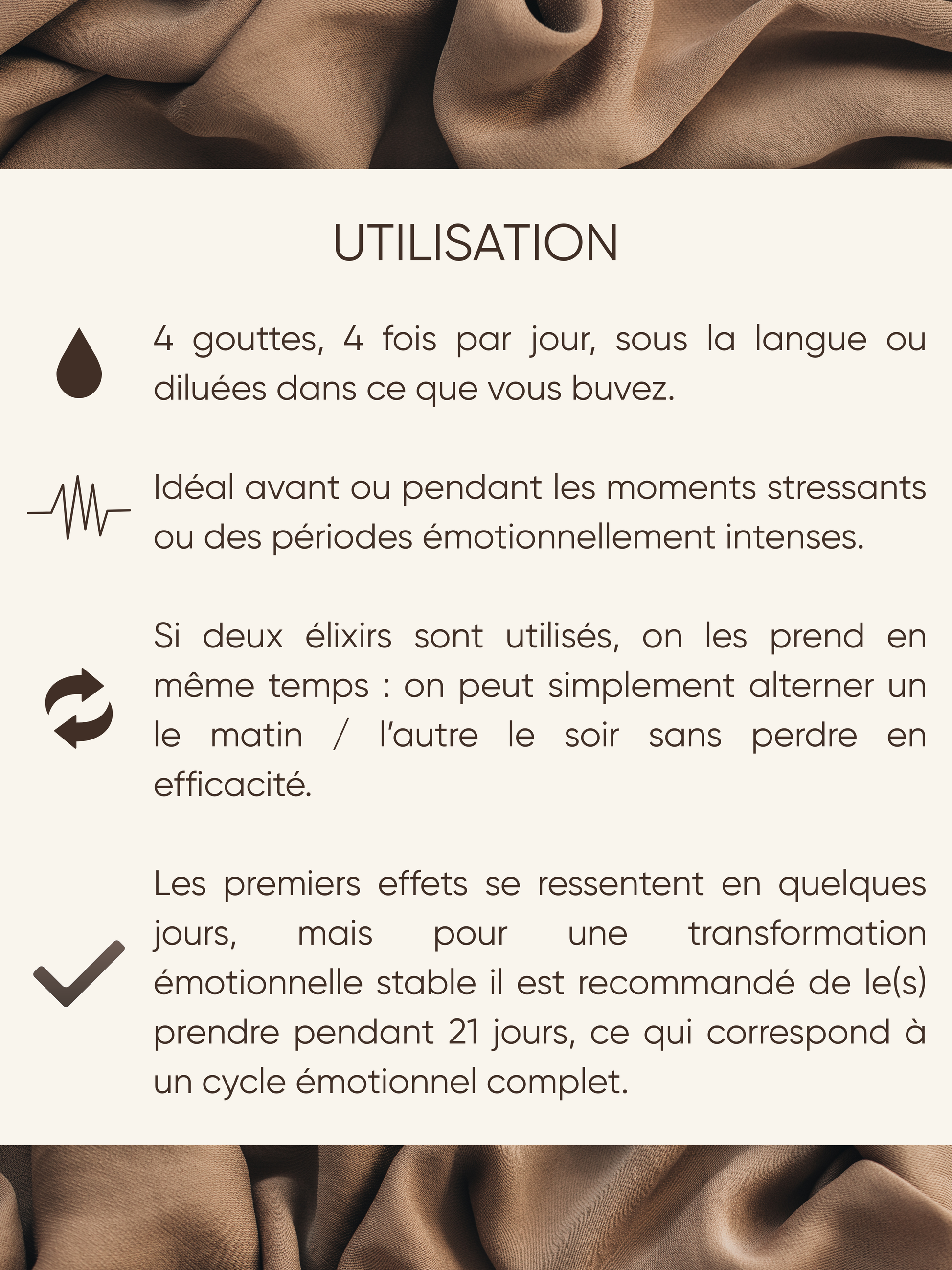 Durée d’utilisation : Un élixir se prend idéalement sur une période de 3 semaines, mais peut être prolongé selon les besoins. Écoutez votre ressenti et ajustez si nécessaire.