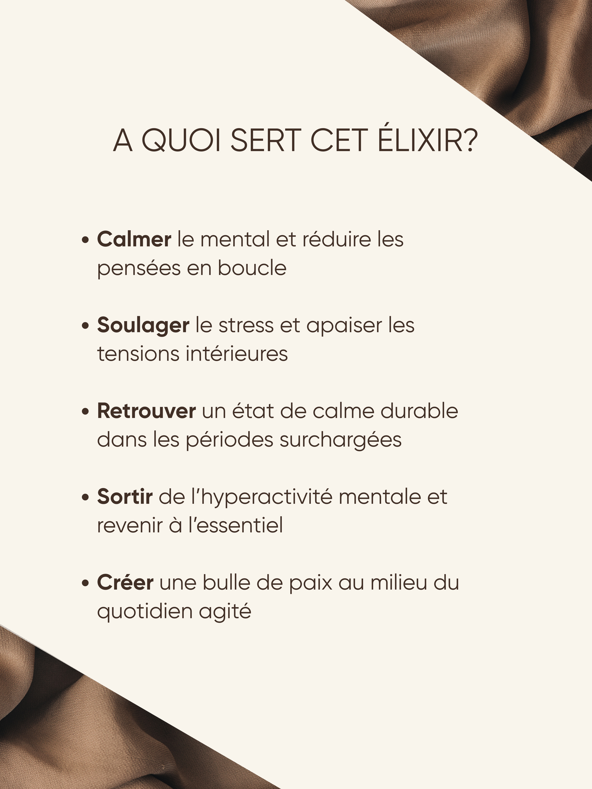 Cet élixir est idéal pour les personnes tendues, mentalement surchargées ou dans le besoin de retrouver leur centre dans des périodes de stress prolongé.