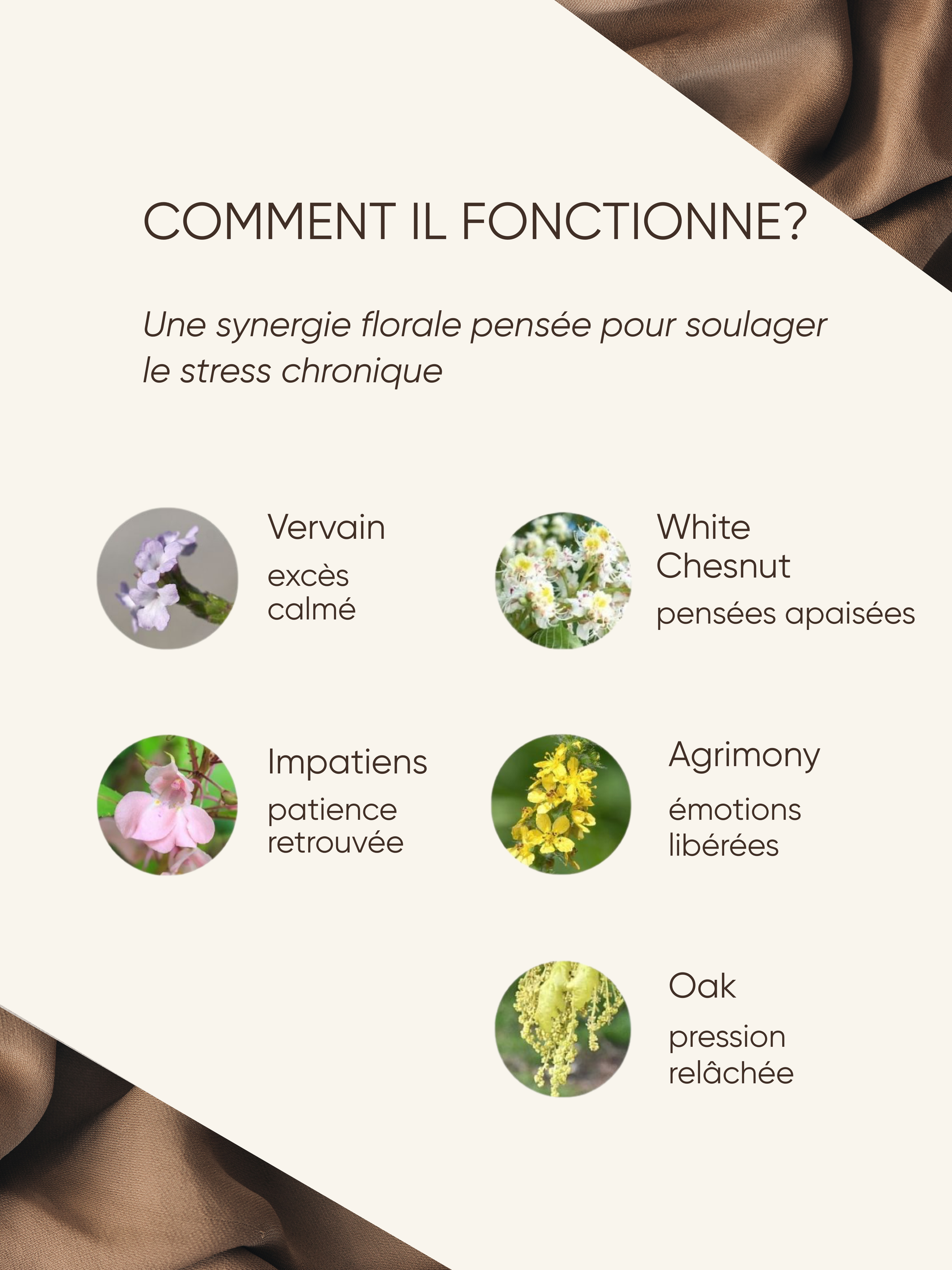 Composition: Agrimony, Impatiens, white chesnut, oak, vervain, eau de source. stabilisé au brandy, (alcool environ 5% vol).