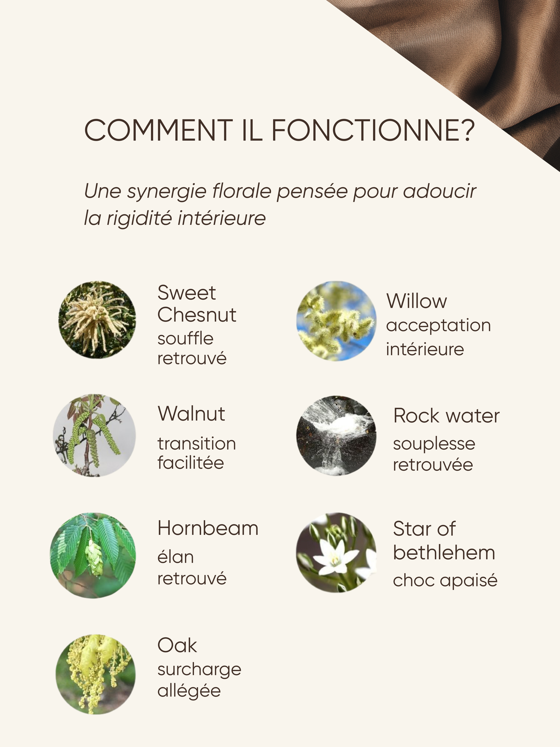 Composition: Oak, elm, willow, hornbean, star of bethlehem, sweet chesnut, walnut, eau de source. stabilisé au brandy (alcool, environ 5% vol).