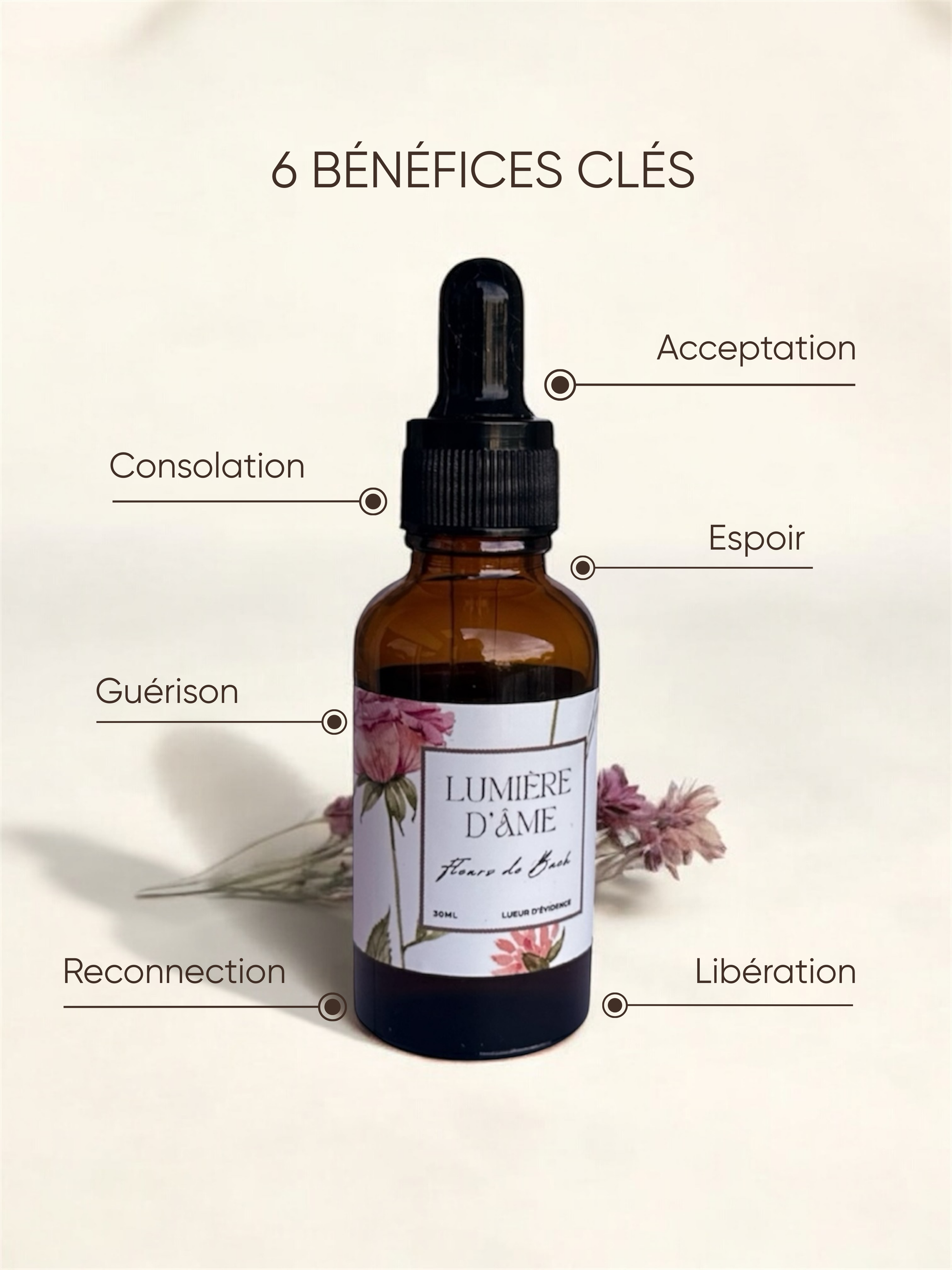 L’élixir Lumière d’Âme a été spécialement élaboré pour accompagner les moments de vulnérabilité intérieure, faciliter les prises de conscience et apaiser les douleurs émotionnelles du passé.