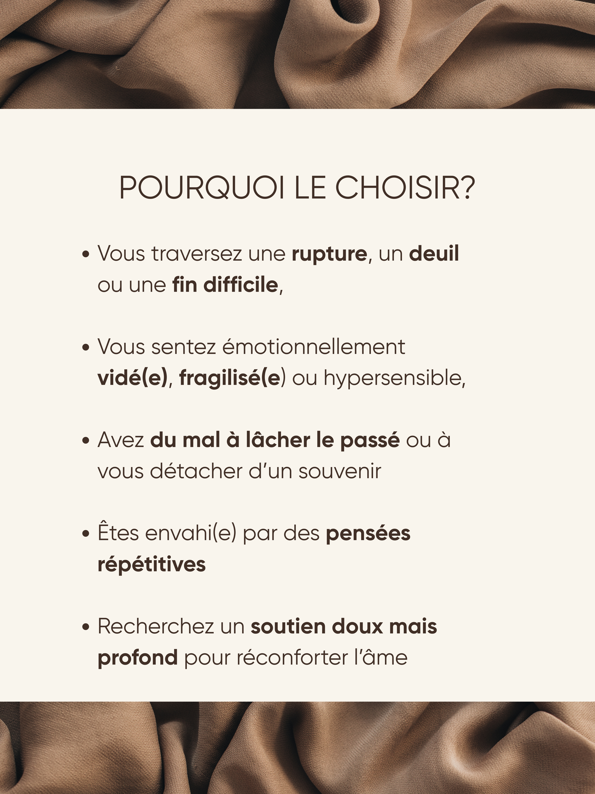 Quand la perte ou le changement crée un vide intérieur, que le cœur peine à se reconstruire et que l’esprit reste prisonnier des pensées douloureuses, Lumière d’Âme apporte un soutien doux mais profond pour réconforter, apaiser et éclairer le chemin vers la sérénité.