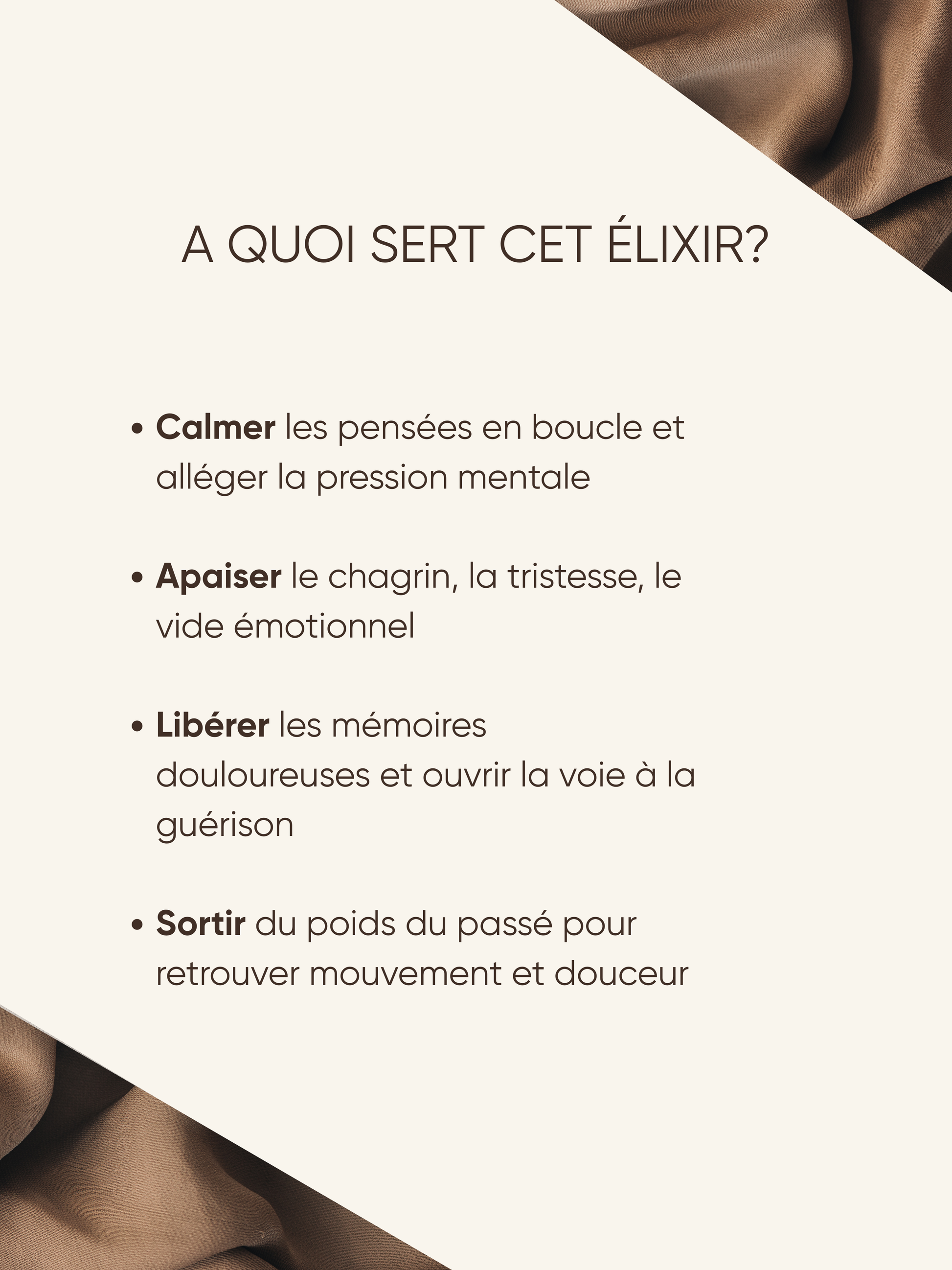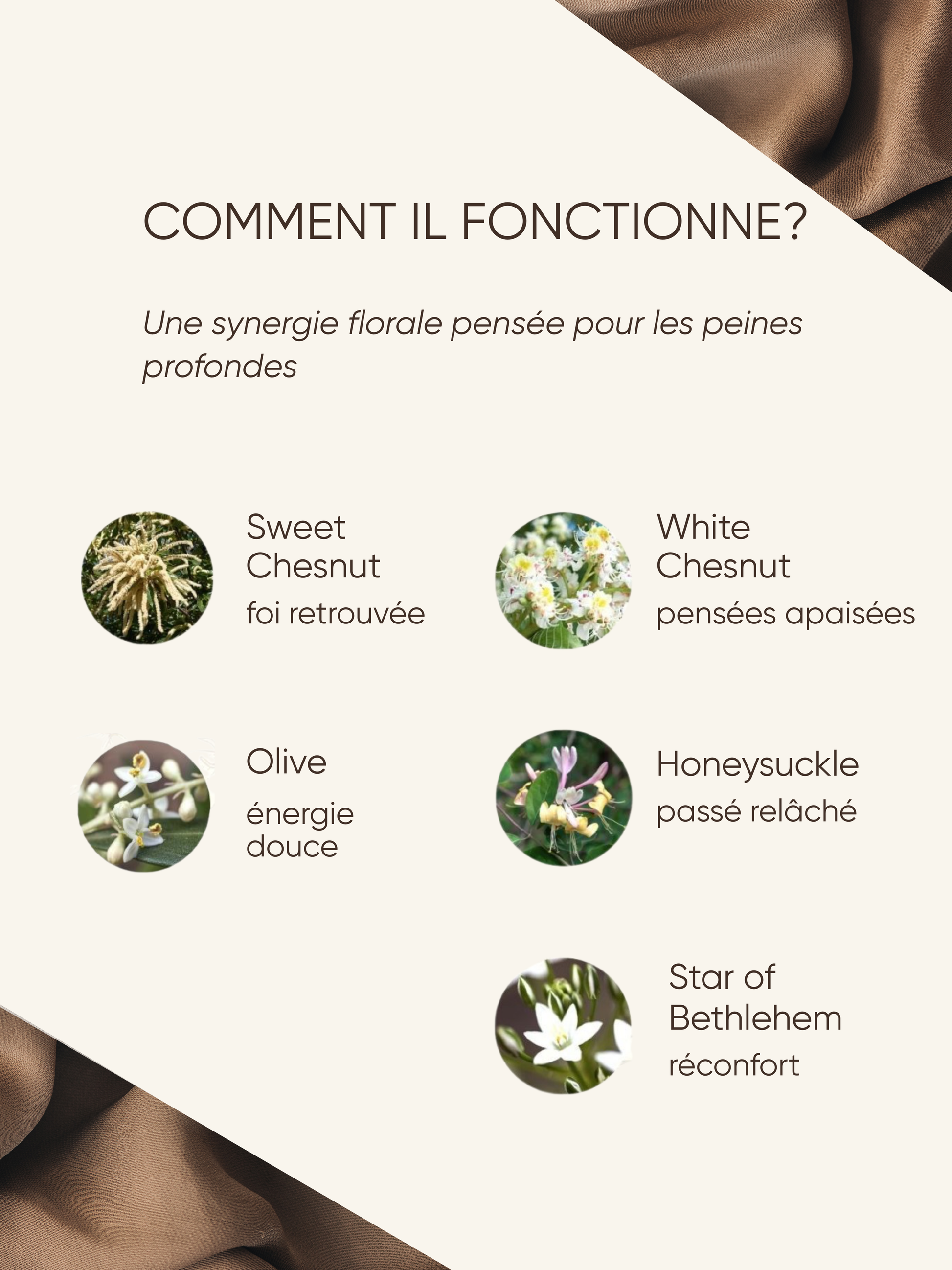 En combinant ces actions, l’élixir permet d’apaiser le mental, réconforter le cœur et avancer avec clarté, douceur et légèreté après un deuil ou une fin douloureuse.