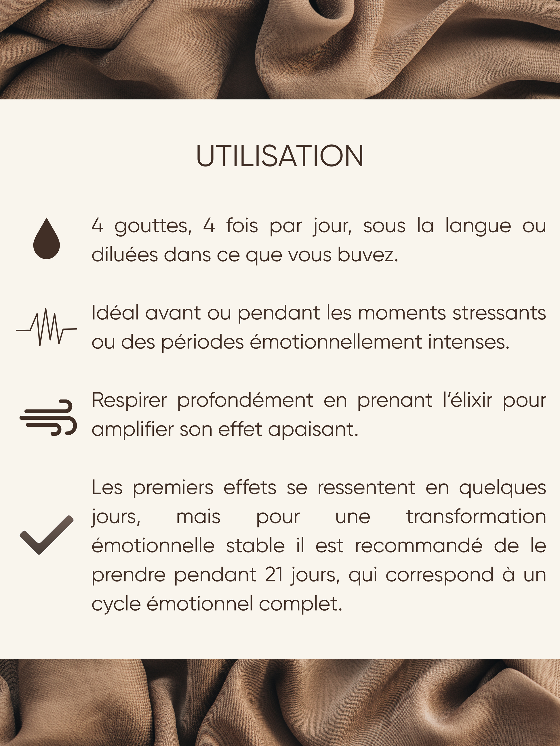 Durée d’utilisation : Un élixir se prend idéalement sur une période de 3 semaines, mais peut être prolongé selon les besoins. Écoutez votre ressenti et ajustez si nécessaire.