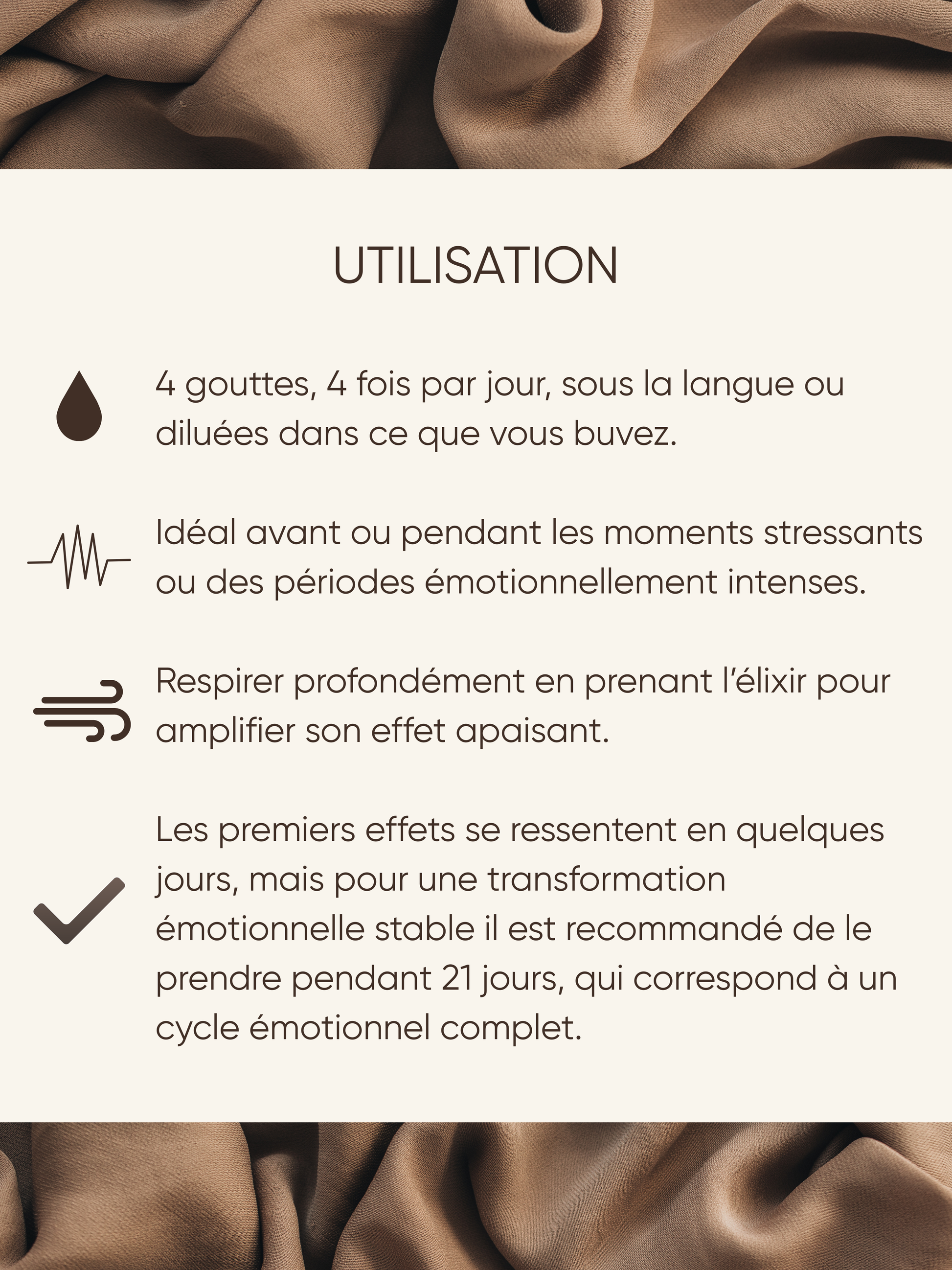 Utilisation: 4 gouttes sous la langue ou dans un verre d’eau, 4x par jour. Vous pouvez également mettre 4 gouttes de votre élixir dans une bouteille d'eau, à boire au long de votre journée.